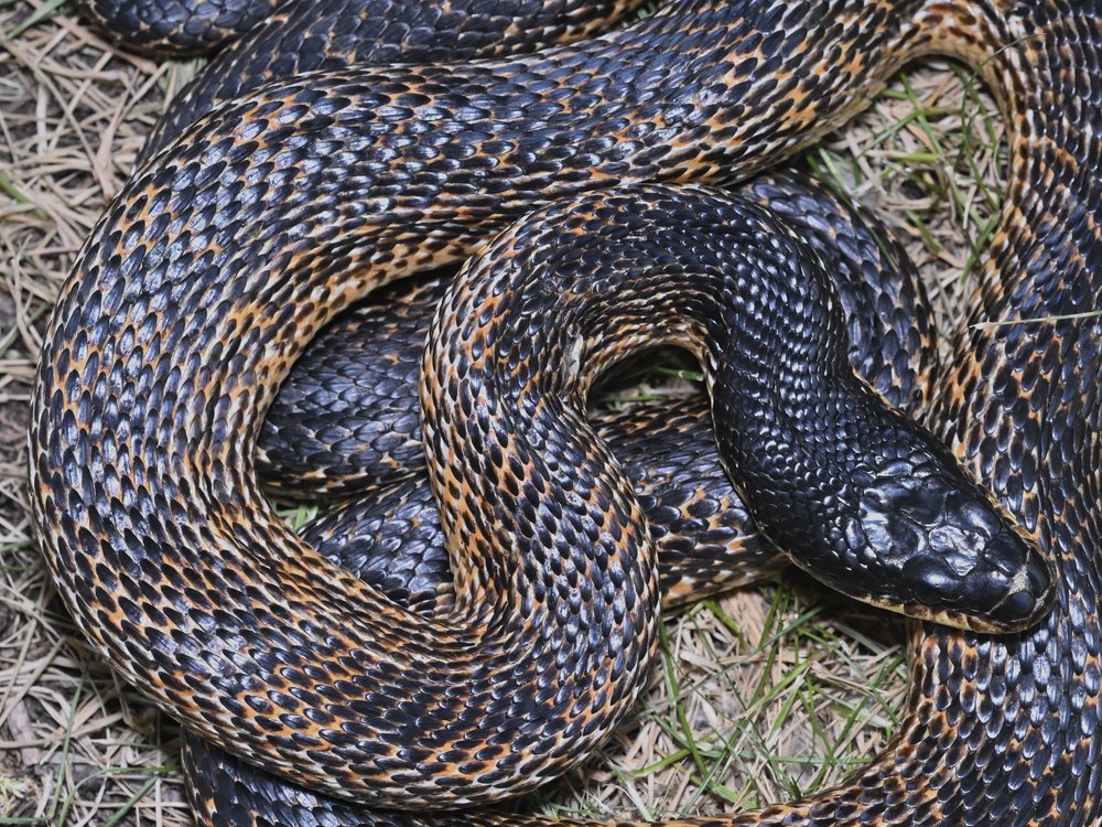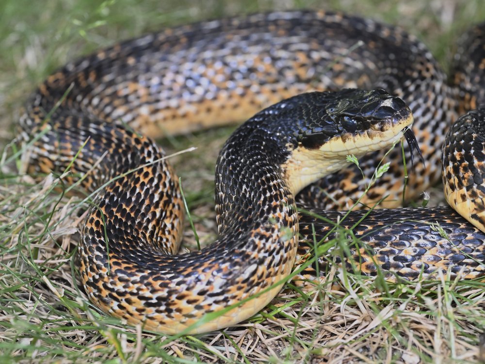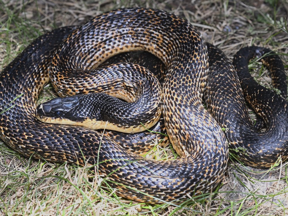 It is one of the largest snakes in the region, with some adults exceeding two meters in length. Adults have a black head and a speckled yellow-orange body with darker blotches and keeled dorsal scales. The underside is usually a uniform yellow. Juveniles are generally gray with black heads and dark blotches, which contrast more sharply than in adults.